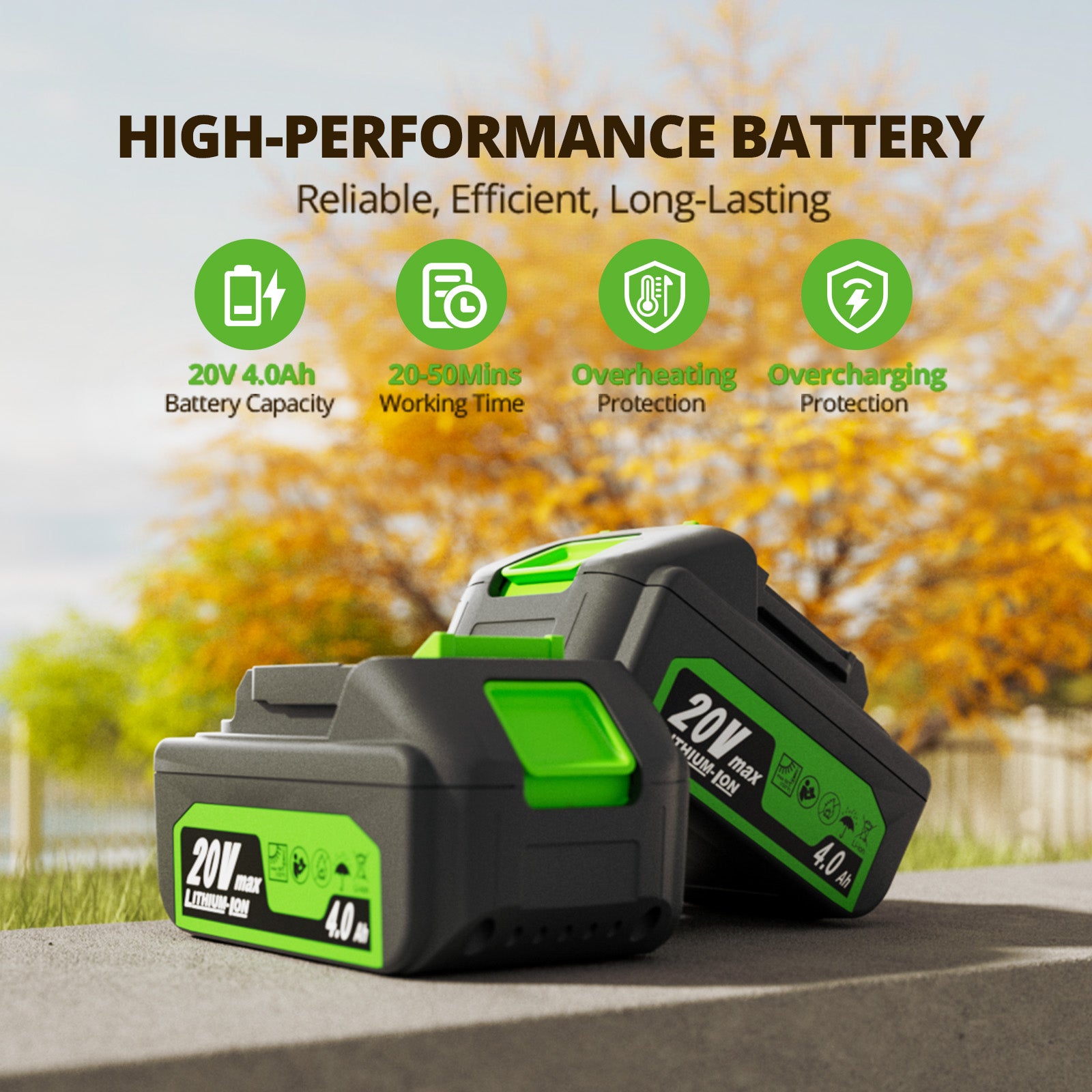 Dual 4.0Ah batteries deliver up to 50 minutes of runtime, while built-in protection against overheating and overcharging keeps every use safe and efficient.