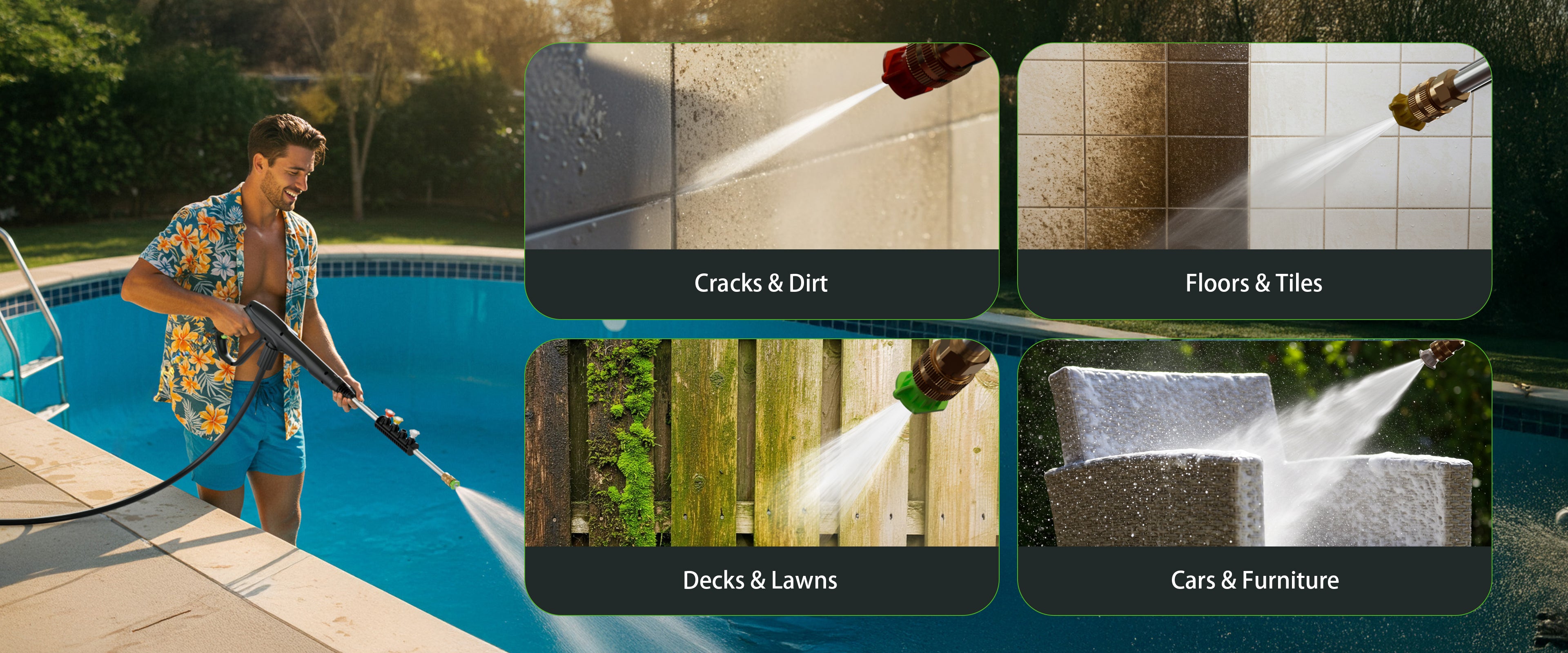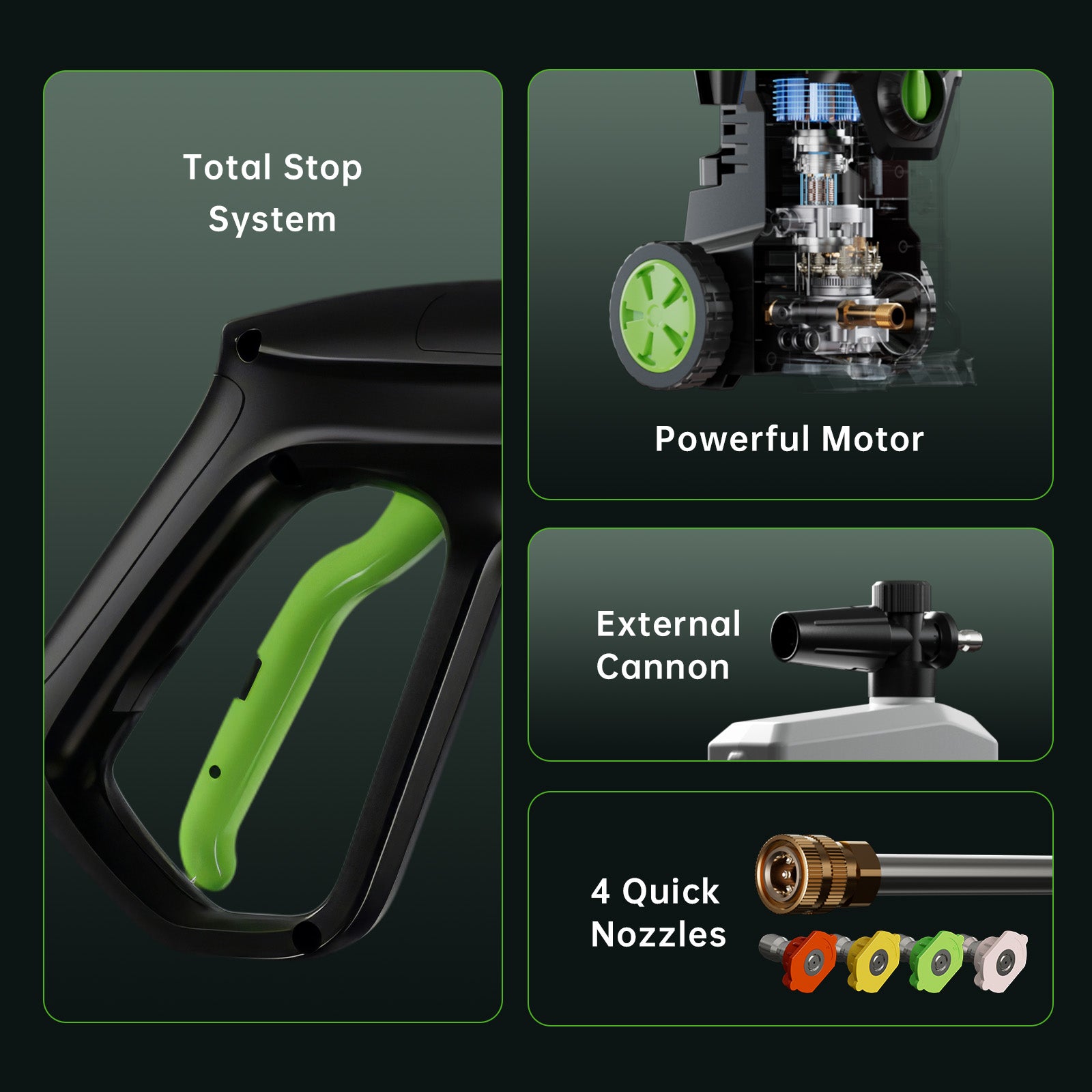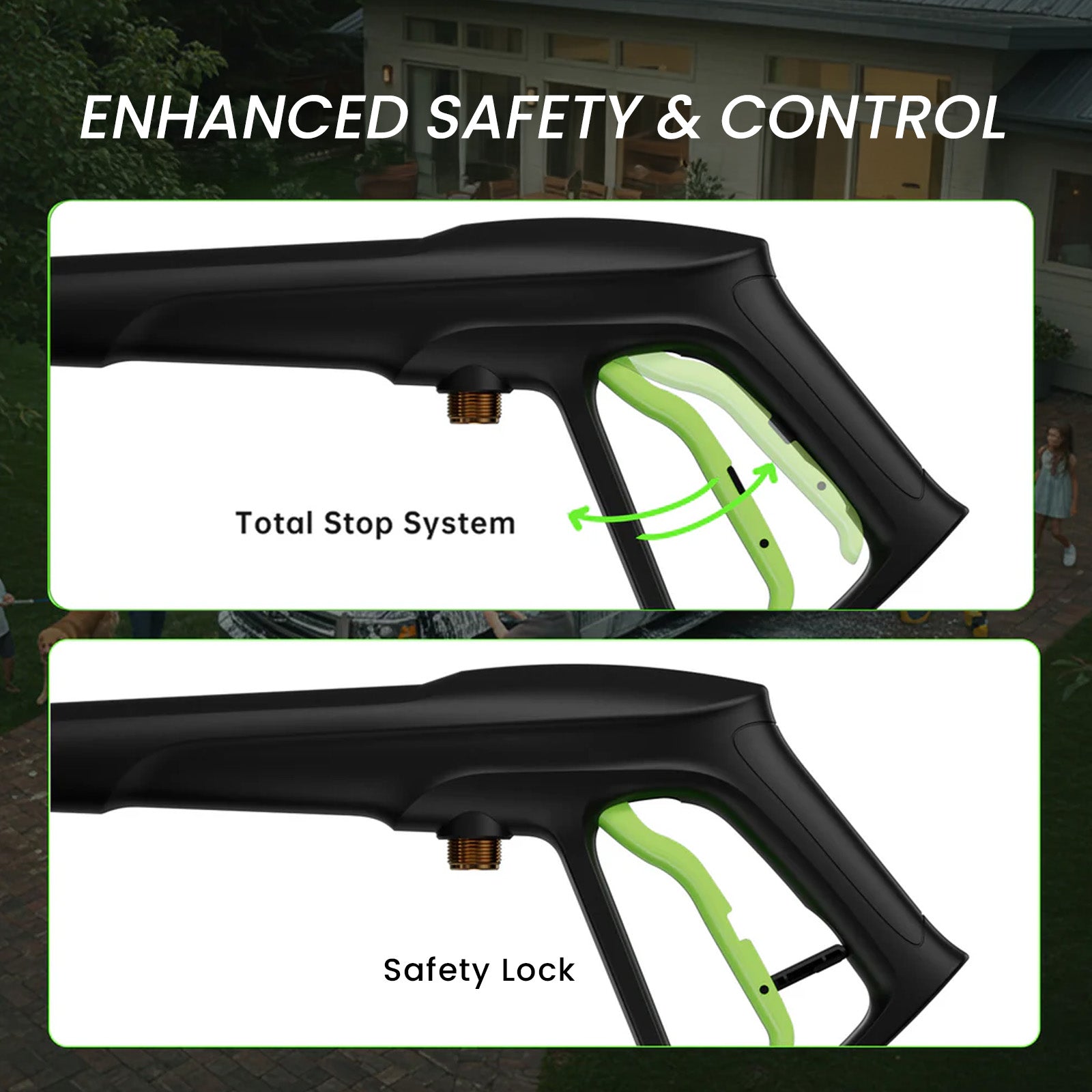 Durable & Safe: Stainless spray gun, reinforced hose, TSS auto-stop, and child-lock handle.